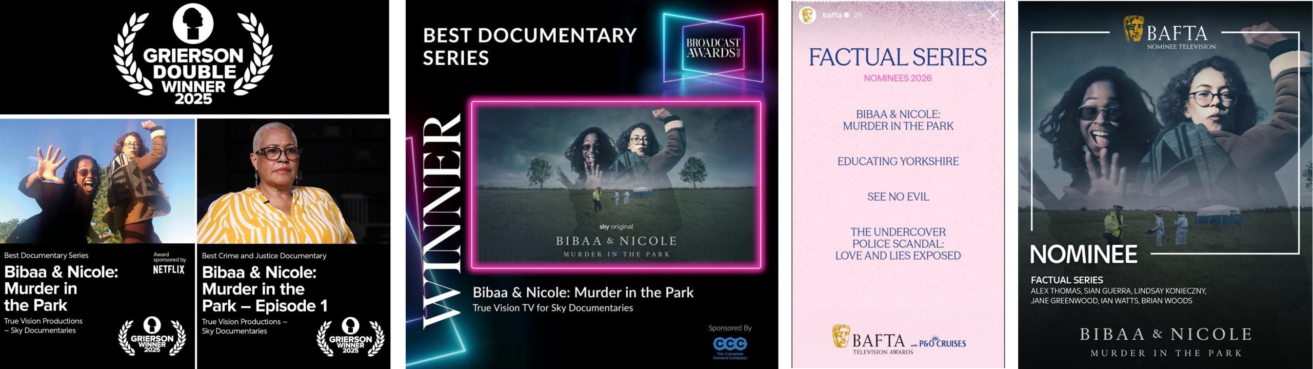 Bibaa & Nicole: Murder in the Park (Sky Docs, 3×60 mins True Vision TV) Director: Alex Thomas Producer Sian Guerra Producer/Director Lindsay Konieczny Exec Producer Brian Woods. Raw and emotional doc series exploring institutional racism and violence against women. Grierson Awards 2025 Winner Netflix Best Documentary Series & Best Crime & Justice documentary. Winner Broadcast Best documentary series 2025. BAFTA nominee 2026.